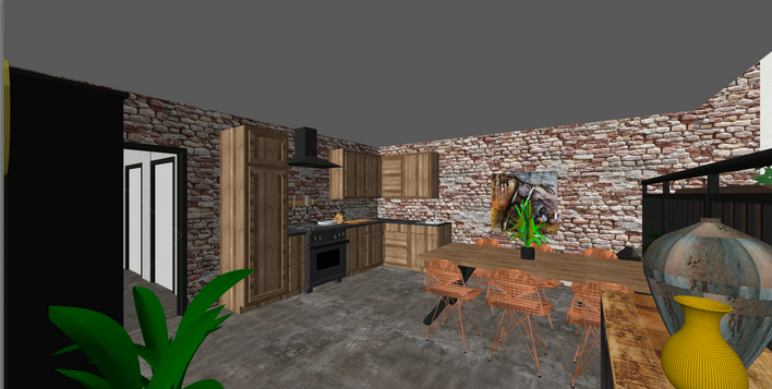 Verder heb ik rustieke materialen terug laten komen in het ontwerp. Hierbij moet je denken aan een bakstenen muur met scheuren erin, betonnen wanden/vloeren, rustiek gerecycled hout en metaal. Leer was ook een goede optie om toe te passen, omdat dit ook goed bij de stijl past. Ik heb fabriekselementen terug laten komen in het ontwerp, zoals buizen die bloot worden gelegd. Het moet er zo industrieel mogelijk uitzien. Het ontwerp krijgt zo een warme, maar toch ook koude uitstraling.